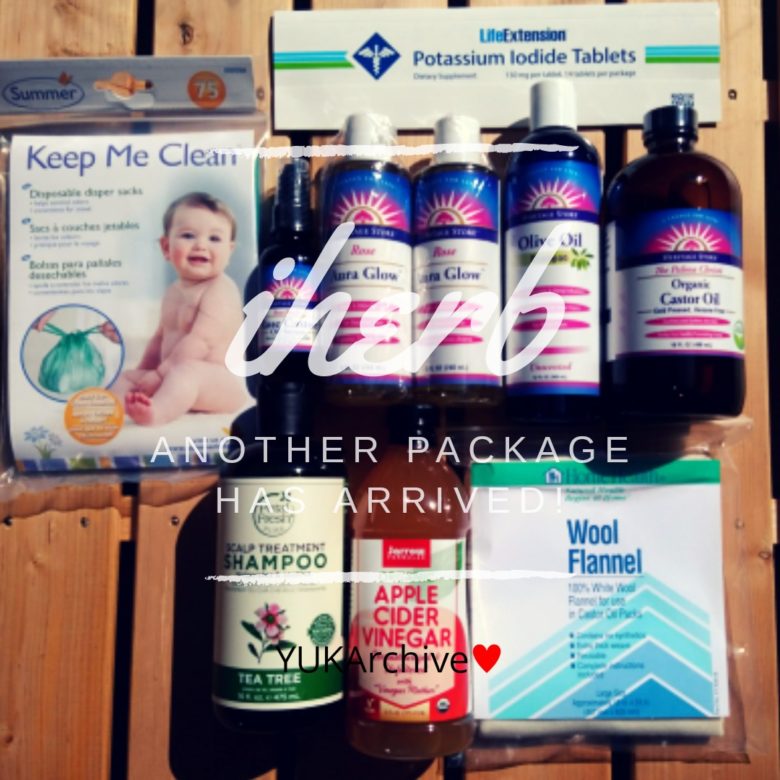 Heritage storeのひまし油、オーラグロー、シャンプー、フランネル、アップルサイダービネガー、震災備蓄用にヨウ素、Petal freshのティーツリーシャンプー、Keep me cleanのおむつ袋です。